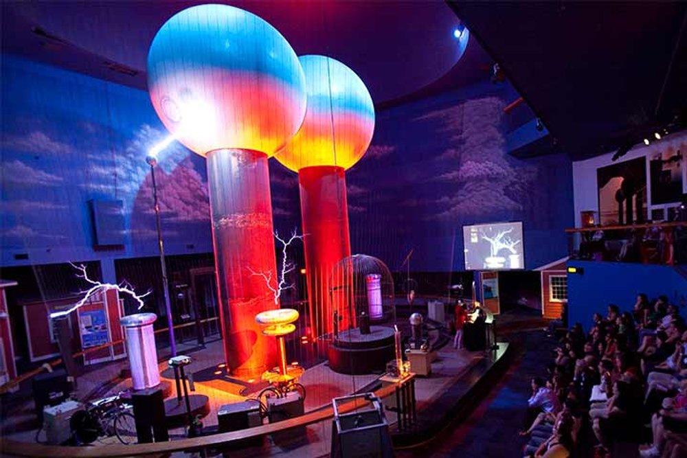 Testemunhe os raios produzidos dentro de casa pelo maior gerador Van de Graaff do mundo, e desperte a centelha emocionante de condutores, isoladores, eletricidade, magnetismo, e segurança de tempestade.