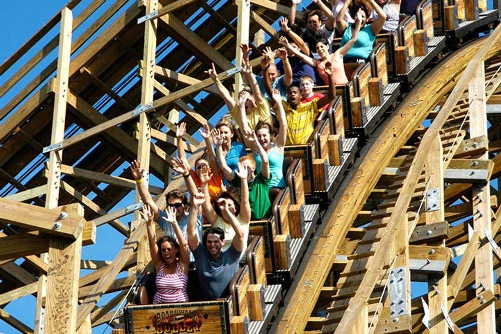 A Boardwalk bullet é uma montanha-russa de madeira que atinge velocidades de 51 MPH (82 km/h) e tem uma emocionante primeira queda vertical de 92 pés (28 metros).